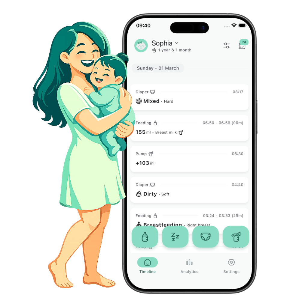 Log the essentials in seconds with one clear timeline for feed, sleep, diaper, health, growth, and pump records.